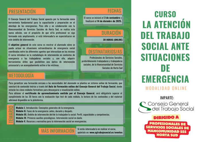 En colaboración con la Coordinación de los Servicios Sociales de la Mancomunidad de Horta Sud, se realiza esta nueva edición del curso en modalidad online “Capacitación y supervisión de las profesionales de Servicios Sociales y otras entidades en intervención en Emergencias Sociales”, con el propósito de que el/la profesional se siga formando más ampliamente, si está interesado/a en especializarse en este ámbito de intervención.