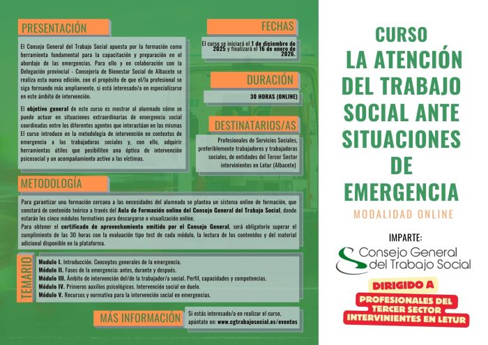 En colaboración con la Delegación Provincial – Consejería de Bienestar Social de Albacete, se realiza esta nueva edición del curso en modalidad online “Capacitación y supervisión de las profesionales de Servicios Sociales y otras entidades en intervención en Emergencias Sociales”, con el propósito de que el/la profesional se siga formando más ampliamente, si está interesado/a en especializarse en este ámbito de intervención.
