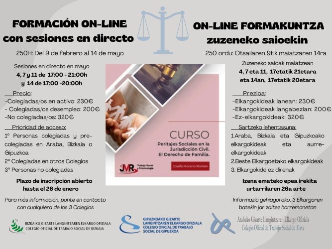 Horariodel lunes 09 de Febrero al jueves 14 de Mayo de 2026Este curso ofrece una formación especializada para poder peritar en la jurisdicción civil, concretamente en los procedimientos especiales referidos al Derecho de Familia. Teniendo en cuenta que el informe pericial se constituye en un instrumento en el que el juez o jueza puede apoyarse a la hora de tomar una decisión, y que los y las profesionales del trabajo social vamos a estar presente como peritos en todos los procedimientos en los que existan hijos o hijas menores de edad, se hace imprescindible conocer la metodología para poder realizar estos informes. Hacemos especial referencia a los informe periciales relativos a las medidas de guarda y custodia y régimen de visitas en relación a los menores de edad que se adoptan en los procesos de nulidad, separación y divorcio.