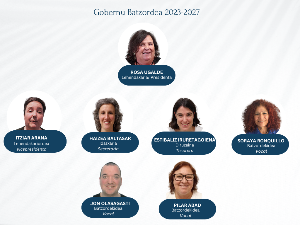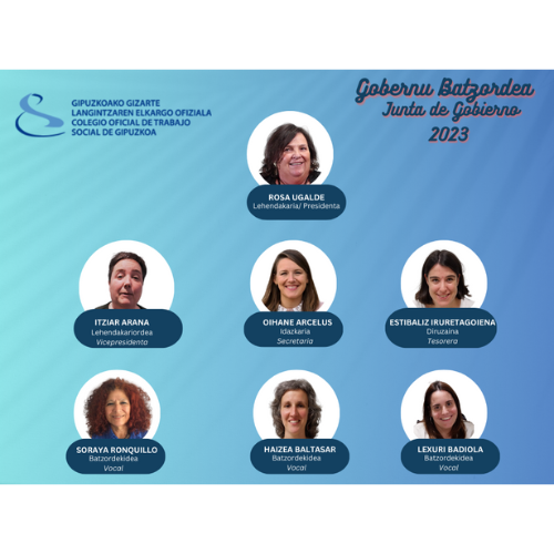 La Junta de Gobierno del Colegio de Trabajo Social de Gipuzkoa está compuesta actualmente por siete colegiadas/os, cuyas funciones y fines se rigen por los Estatutos del Colegio. Celebra cuantas reuniones sean necesarias para el normal funcionamiento del Colegio, coordinándose con la Secretaría. Se realizan al menos 12 reuniones al año.