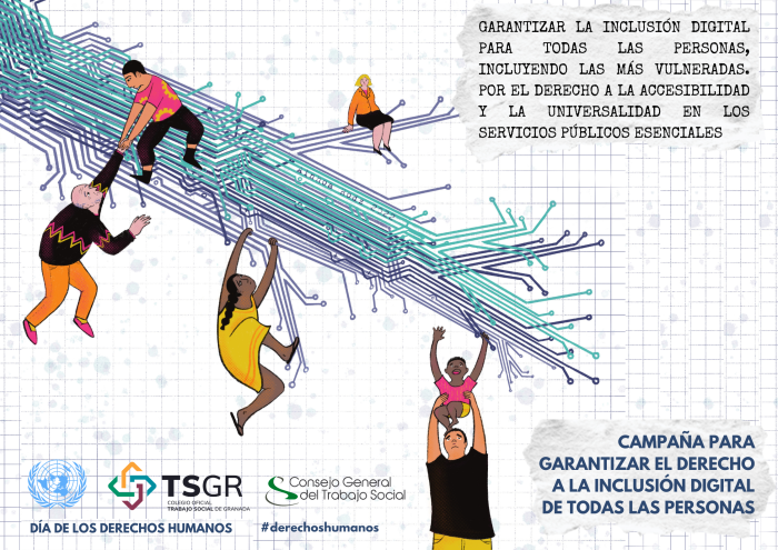 Cuando se acerca la fecha de conmemoración del Día de los Derechos Humanos, el Colegio Profesional Trabajo Social de Granada y el Consejo General del Trabajo Social lanzan la Campaña “ GARANTIZAR LA INCLUSIÓN DIGITAL PARA TODAS LAS PERSONAS, INCLUYENDO LAS MÁS VULNERADAS”, una campaña con la que expresar los desafíos que para el acceso a los servicios esenciales públicos, y el ejercicio de los derechos, posee la brecha digital que afecta, especialmente, a colectivos especialmente vulnerados y con graves desigualdades estructurales.