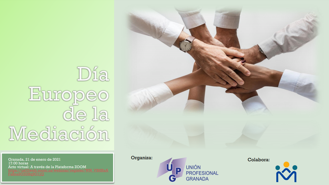 Desde el Colegio Oficial de Trabajo Social de Granada y como miembros activos de Unión Profesional de Granada, nos gustaría invitaros al acto virtual que Unión Profesional de Granada celebra con motivo del día Europeo de la Mediación el próximo 21 de enero de 2021 a las 17:00 horas.
