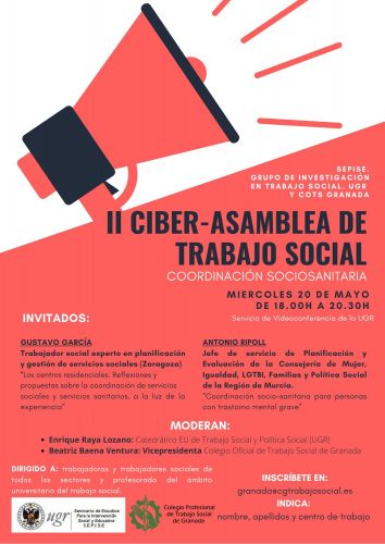 Desde el COTS de Granada y el Grupo de Investigación SEPISE, Grupo de investigación en trabajo social UGR de la Universidad de Granada queremos invitar a todas las trabajadoras y trabajadores sociales interesados en participar a la II CIBER-ASAMBLEA GRANADINA DE TRABAJO SOCIAL con el Tema de debate: “La Coordiinación Sociosanitaria”.