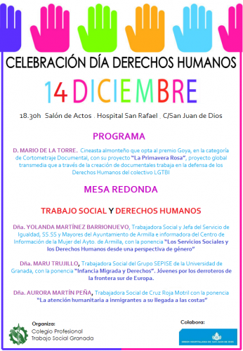 La Junta de Gobierno del Colegio de Trabajo Social de Granada, se complace en invitarle al Acto que tendrá lugar el próximo jueves día 14 de diciembre a las 18.30h en el Salón actos del Hospital San Rafael (C/San Juan de Dios), para celebrar el Aniversario anual del Colegio y Conmemorar el Día de los Derechos Humanos.
