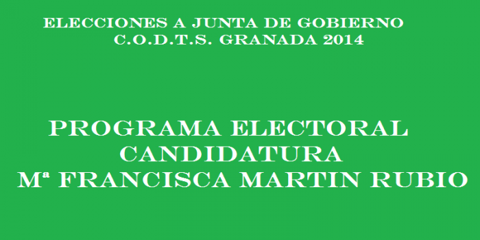Tras las votaciones acontecidas el día 22 de julio de 2014 y no observarse ni presentarse reclamaciones a la misma y según el Acta de Clausura y Escrutinio con misma fecha, queda PROCLAMADA LA CANDIDATURA ELECTA DE FRANCISCA MARTIN RUBIO según lo dispuesto en el artículo 47 de Procedimiento electoral de los Estatutos del Colegio Oficial de Diplomados en Trabajo Social y Asistentes Sociales de Granada.
