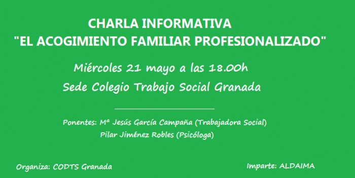 El próximo miércoles, día 21 de mayo, a las 18.00 h., en la sede del Colegio de Trabajo Social de Granada, la asociación ALDAIMA imparte una charla informativa sobre el acogimiento familiar, el recurso de protección preferente para niños y niñas en situación de Desamparo, bajo el título: “El Acogimiento Familiar Profesionalizado”.