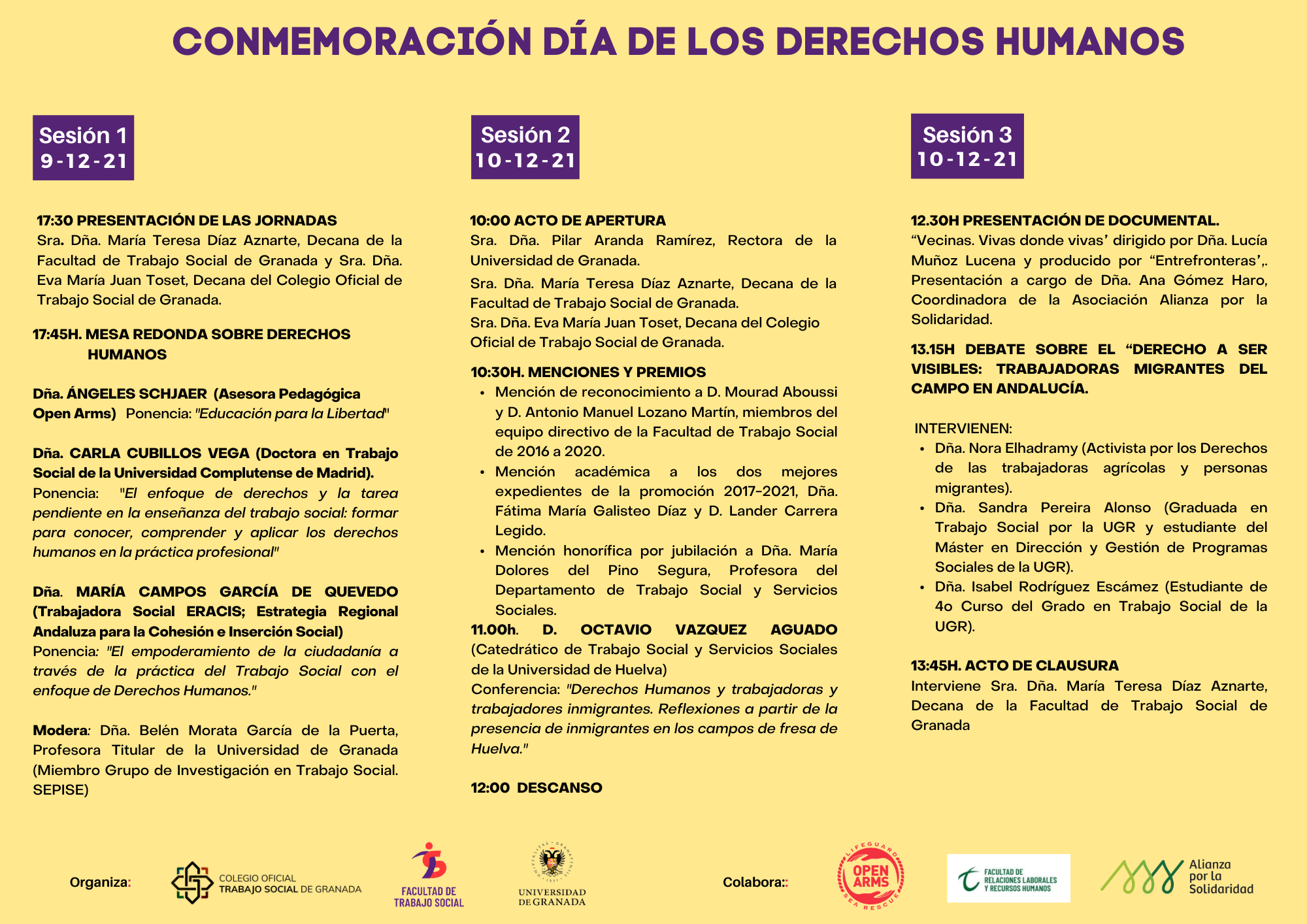 Es un placer para el Colegio, invitaros a las Jornadas que tendrán lugar los próximos días 9 y 10 de diciembre de 2021 en conmemoración del Día de los Derechos Humanos, y que ha organizado el Colegio junto con la Facultad de Trabajo Social de Granada