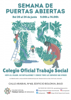 Desde el Colegio Oficial de Trabajo Social de Granada os invitamos a participar en las jornadas de puertas abiertas que celebraremos desde hoy día 20 al 24 de junio de 2022, de 9:00 a 14:00 horas. Una oportunidad para conocer los servicios e instalaciones del Colegio.