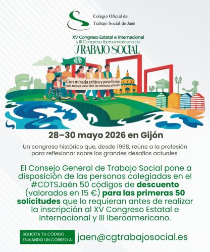 El Consejo General de Trabajo Social pone a disposición de los/as colegiados/as del Colegio Oficial de Trabajo Social de Jaén un código de descuento para la inscripciones al XV Congreso Estatal y Internacional y III Congreso Iberoamericano.
