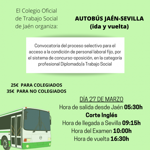 Autobús Jaén-Sevilla, Sevilla-Jaén con motivo del examen de convocatoria del proceso selectivo para el acceso a la condición de personal laboral fijo, por el sistema de concurso-oposición, en la categoría profesional Diplomado/a Trabajo Social, el domingo 27 de marzo.