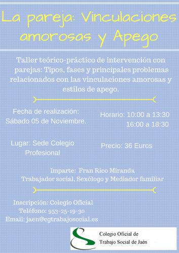 El 5 de noviembre, Francisco Rico Miranda (trabajador social, mediador y sexólogo) impartirá el Taller teórico-práctico de intervención con parejas: Tipos, fases y principales problemas relacionados con las vinculaciones amorosas y estilos de apego.
