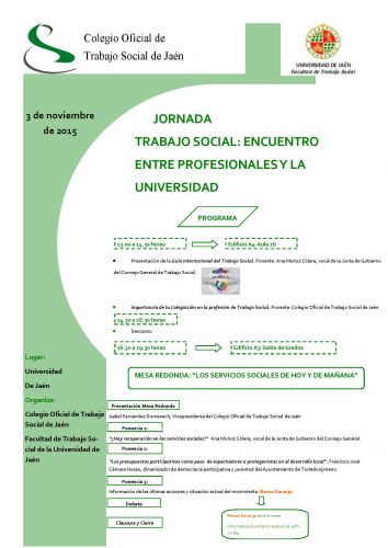 El Colegio de Trabajo Social de Jaén junto con la Facultad de Trabajo Social de la Universidad de Jaén han organizado una jornada bajo el título: Trabajo Social: Encuentro entre Profesionales y la Universidad, para el próximo martes, 3 de noviembre.