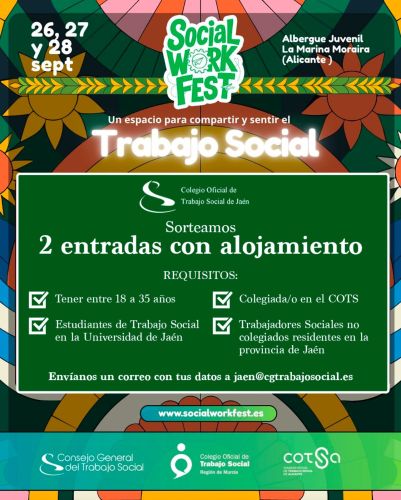 Desde el COTS JAÉN sorteamos 2 ENTRADAS para el SOCIAL WORK FEST. Este festival se celebrará los días 26,27,28 de septiembre de 2025 en Albergue Juvenil La Marina Moraima (Alicante).