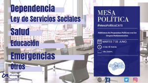 Esta Mesa Política tiene por título “Hablemos de Propuestas Políticas con los Grupos Parlamentarios” y se tocarán aspectos relacionados con Dependencia, Ley de Servicios Sociales, Salud, Educación, Emergencias, entre otros.