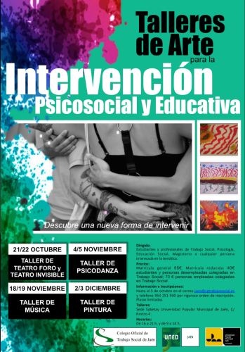 El Colegio de Trabajo Social de Jaén junto con la UNED Jaén y la Universidad Popular de Jaén ha organizado “LOS TALLERES DE ARTE PARA LA INTERVENCIÓN PSICOSOCIAL Y EDUCATIVA”.