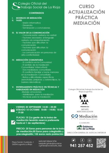 Nº de plazas: 15 (Hasta el 1 de septiembre tendrán preferencia las personas que integran el listado de mediadores del Colegio)