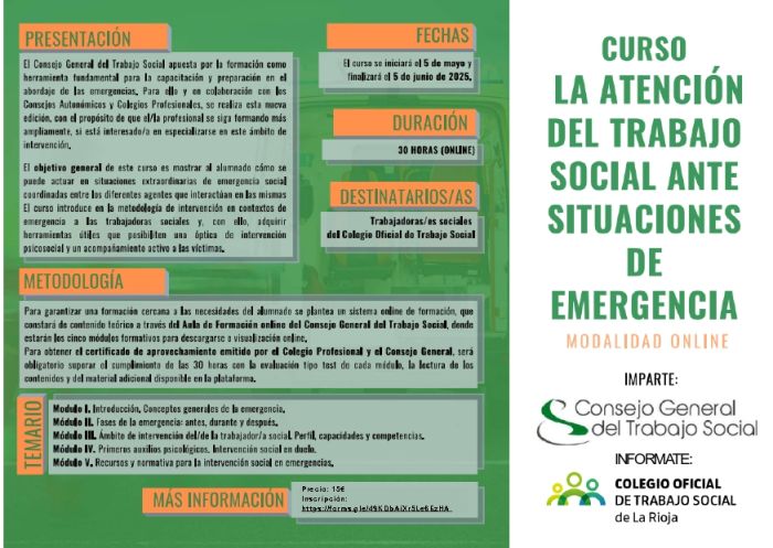 Curso organizado por el Consejo General del Trabajo Social dentro del marco de actuación del Grupo Estatal de Intervención en Emergencias Sociales (GEIES), en colaboración con el Colegio Oficial de Trabajo Social de La Rioja.