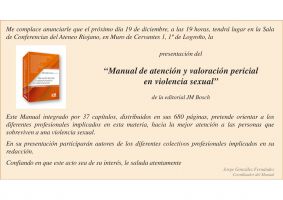 El próximo 19 de diciembre a las 19 h, tendrá lugar la presentación del “Manual de atención y valoración pericial en violencia sexual”, en la Sala de Conferencias del Ateneo Riojano, en Muro de Cervantes 1, 1º de Logroño.
