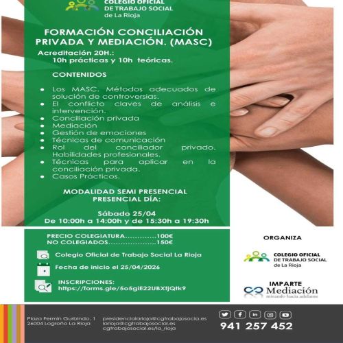 Esta acción formativa está dirigida a profesionales del Trabajo Social interesados/as en ampliar sus competencias en el ámbito de la resolución alternativa de conflictos, un campo en creciente desarrollo dentro del ejercicio profesional.