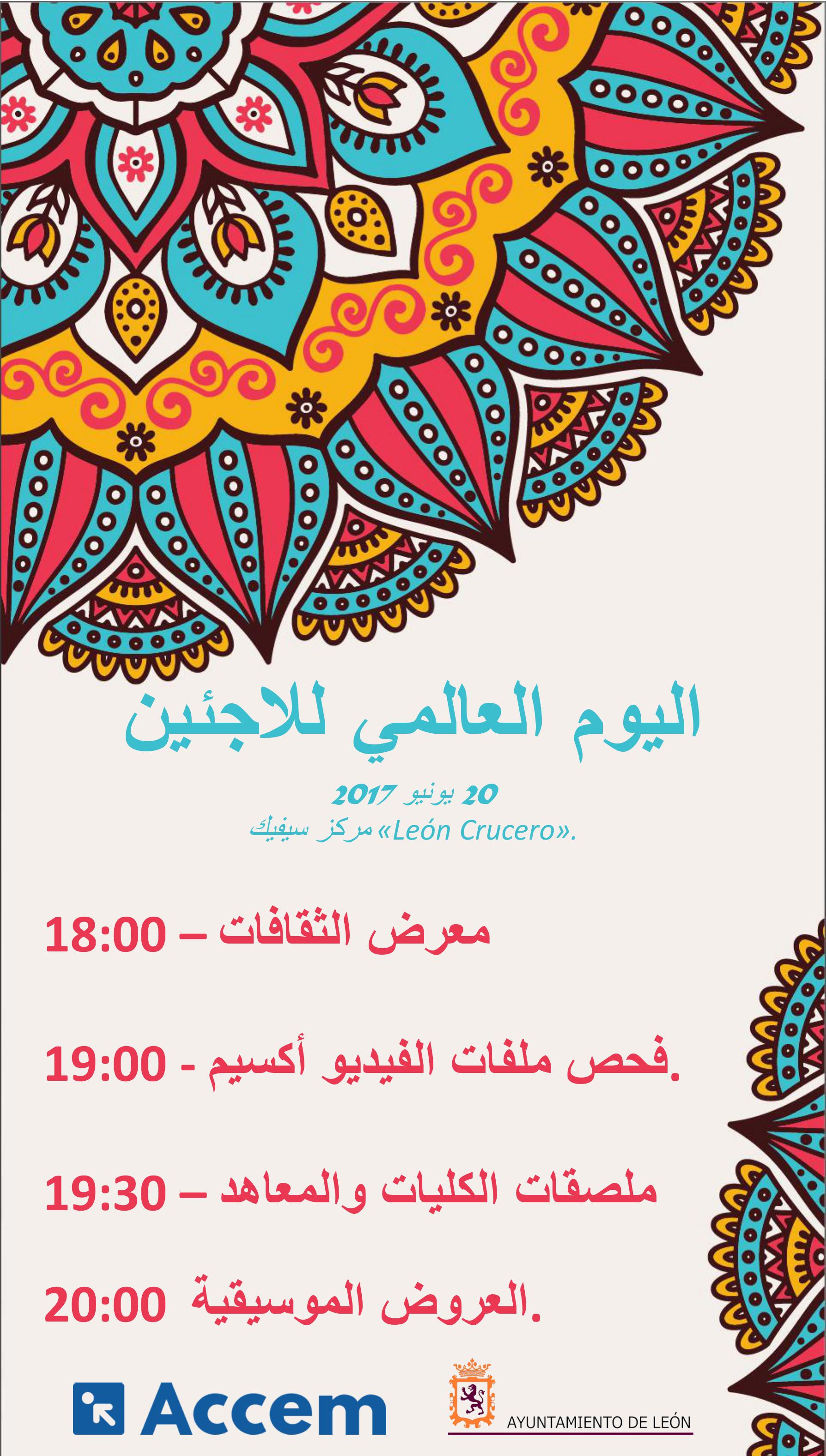 Durante el 20 de junio de 2017, en León; se organiza un día festivo y de re-encuentro entre ex/residentes del Centro de Acogida a Refugiados, trabajadores, voluntarios, profesionales y colaboradores con nuestra entidad. Los propios residentes del Centro de Acogida, están organizando una feria intercultural con actividades culturales y tradicionales de otras culturas. Esta feria dará comienzo a las 18:00 horas, y se organizarán talleres de henna, tu nombre en árabe, murales kurdos, mesas de cultura africana y gastronomía de Venezuela. El Ayuntamiento de León, y la Concejalía de Servicios Sociales del Ayuntamiento de León, colabora en esta iniciativa.