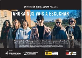 La Fundación Isadora Duncan organiza el acto para presentar su Guía de prevención de violencia económica y, posteriormente pasaremos al estreno de la campaña audiovisual «Ahora nos vais a escuchar», cuyo argumento se ha inspirado en cuatro situaciones reales de violencia económica que el equipo de la entidad ha atendido y que considera representativas de este tipo de violencia, hasta hace poco tan desconocida.