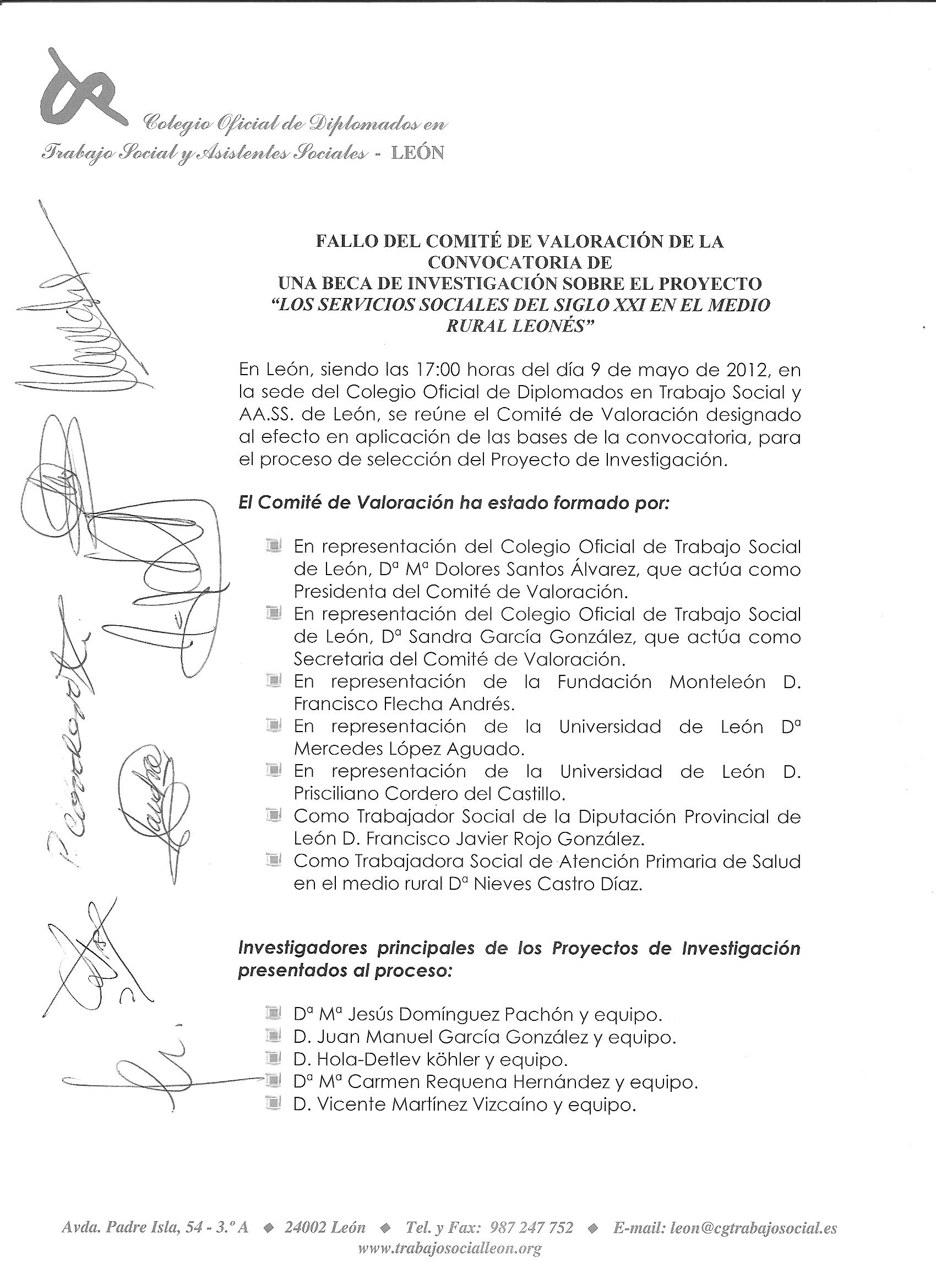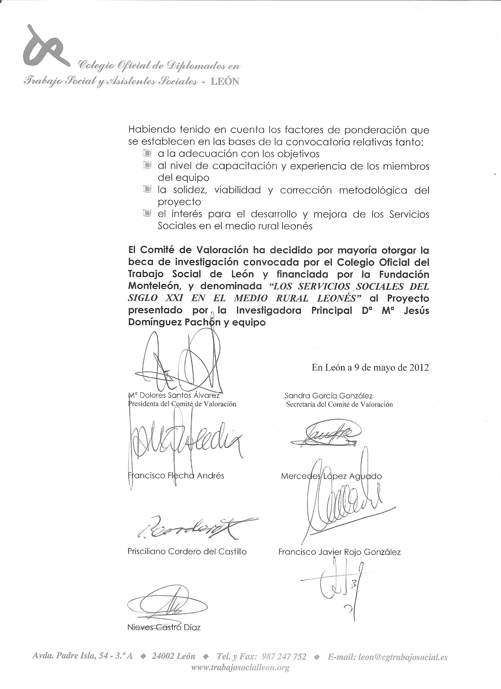 • Dª Mª Dolores Santos Álvarez en representación del Colegio Oficial de Trabajo Social de León. • Dª Sandra García González en representación del Colegio Oficial de Trabajo Social de León. • D. Francisco Flecha Andrés en representación de la Fundación Monteleón. • Dª Mercedes López Aguado en representación de la Universidad de León. • D. Prisciliano Cordero del Castillo en representación de la Universidad de León . • D. Francisco Javier Rojo González como Trabajador Social de la Diputación Provincial de León. • Dª Nieves Castro Díaz coom oTrabajadora Social de Atención Primaria de Salud en el medio rural.Reunido el Comité de Valoración y habiendo tenido en cuenta los factores de ponderación que se establecen en las bases de la convocatoria relativos tanto: a la adecuación con los objetivos, al nivel de capacitación y experiencia de los miembros del equipo, la solidez, viabilidad y corrección metodológica del proyecto, el interés para el desarrollo y mejora de los Servicios Sociales en el medio rural leonés, así como el resto de criterios de valoración indicados en las bases de la convocatoria, se ha decidido por mayoría otorgar la beca de investigación al Proyecto presentado por la Investigadora Principal Dª Mª Jesús Domínguez Pachón y equipo.