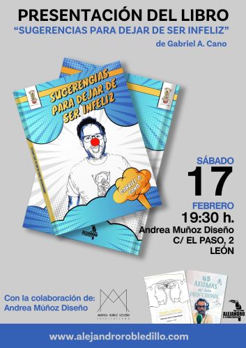Gabriel A. Cano, Trabajador Social y Antropólogo, y Administrador y Gerente de Daganal Servicios Sociales, S. L. hará la presentación pública de su libro “Sugerencias para dejar de ser infeliz” el próximo 17 de febrero de 2024 a las 19:30 h en el establecimiento_ Andrea Muñoz Diseño_, ubicado en la Calle Paso, 2 de León.