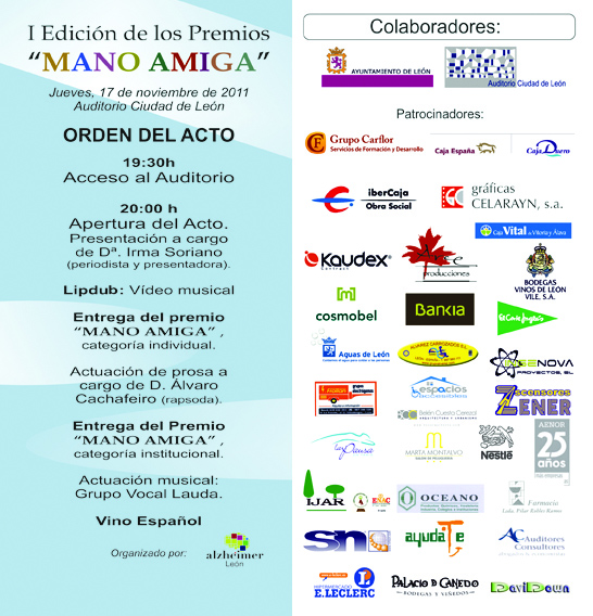 Estimada Sra. Santos, el próximo 17 de noviembre de 2011, a partir de las 19:30 h, en el Auditorio Ciudad de León tendrá lugar la gala de entrega de los Premios “Mano Amiga” promovidos por Alzheimer León, la Asociación quiere invitarle y agradecerle que pueda acompañarnos en este acto. Rogamos confirmación de Asistencia.