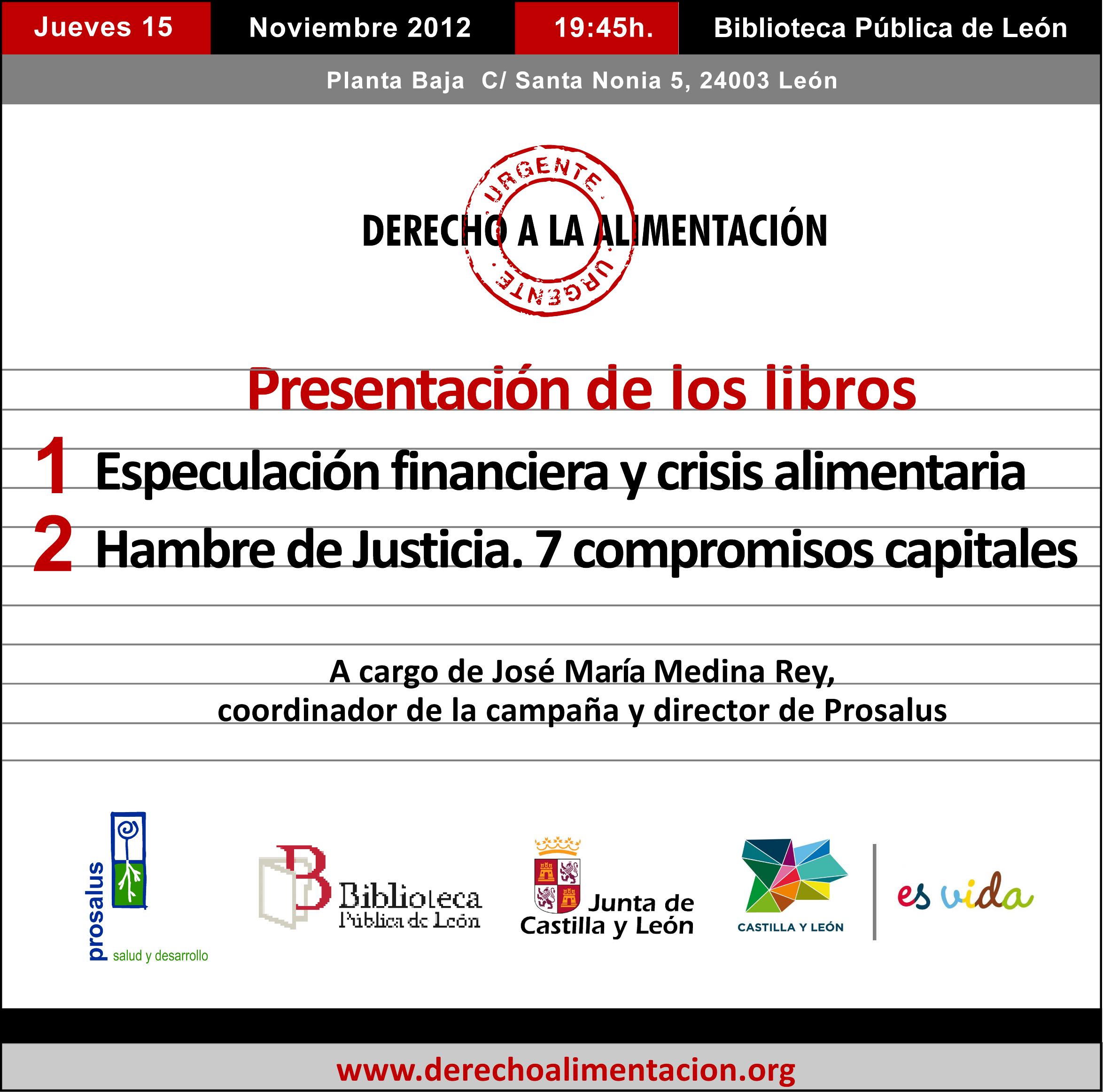 Esta presentación correrá a cargo de Jose María Medina Rey, coordinador de la campaña Derecho a la alimentación y director de Prosalus, y tendrá lugar el día 15 de noviembre a las 19:45 en la Biblioteca Pública de León.