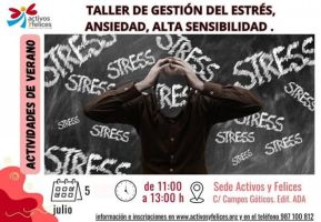 TALLER DE GESTION DEL ESTRES, ANSIEDAD Y ALTA SENSIBILIDAD (5 JULIO) ORGANIZADO POR ASOCIACION ACTIVOS Y FELICES