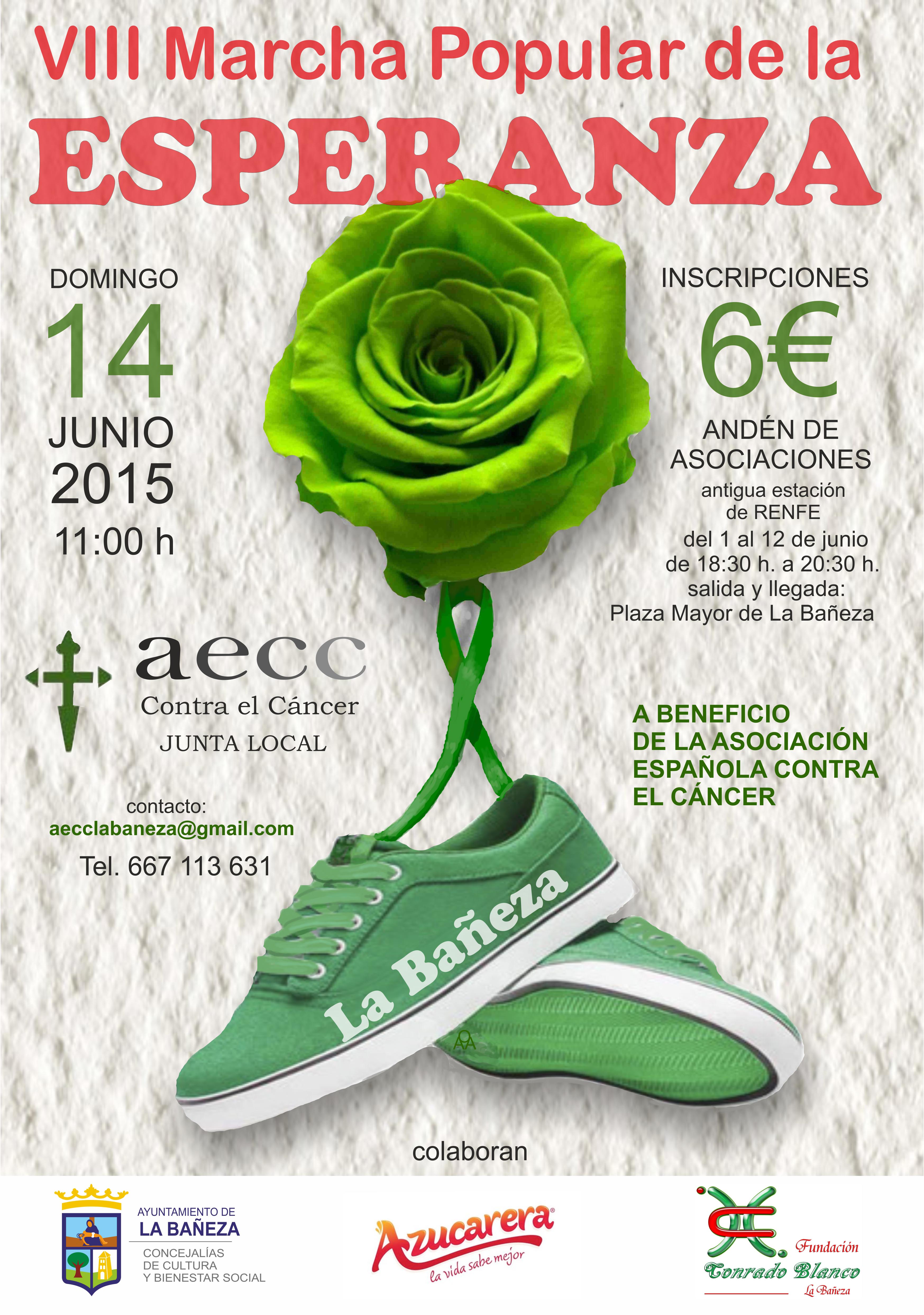 La Junta Local de La Bañeza, de la Asociación Española Contra el Cáncer AECC, tiene el placer de invitarles a participar el domingo 14 de Junio, a las 11:00 horas, en la VIII MARCHA POPULAR DE LA ESPERANZA a beneficio de esta AECC (se adjunta cartel informativo)