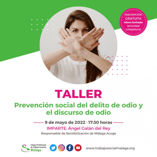 El próximo 9 de mayo de 2022 a las 17:30 horas tendrá lugar un nuevo taller virtual organizado por el Colegio Profesional de Trabajo Social de Málaga. En esta ocasión, Ángel Galán del Rey, responsable de Sensibilización de Málaga Acoge, nos ofrecerá herramientas para la prevención social de los delitos de odio.