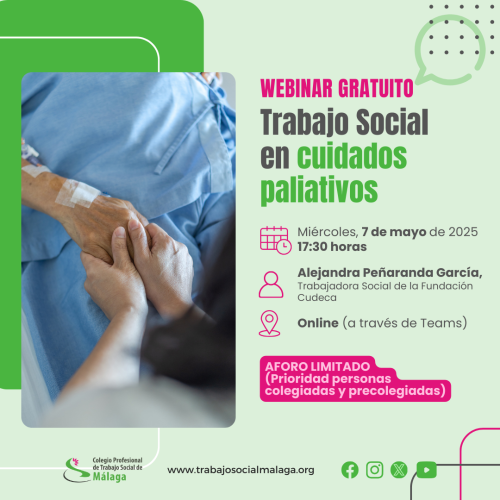 El próximo 7 de mayo de 2025 a las 17:30 horas tendrá lugar una nueva charla organizada por el Colegio Profesional de Trabajo Social de Málaga. En esta ocasión, Alejandra Peñaranda García, Trabajadora Social de la Fundación Cudeca, nos dará a conocer el Trabajo Social en cuidados paliativos.