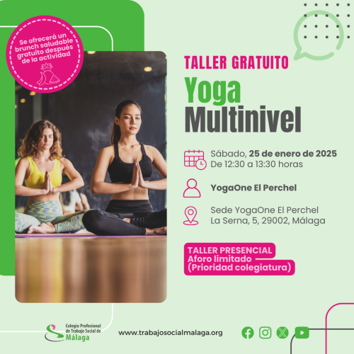 Horariosábado 25 de enero de 2025El Colegio de Trabajo Social de Málaga, en colaboración con YogaOne El Perchel, organiza un taller gratuito donde se ofrecerá una clase especial de Hatha Yoga multinivel. La misma se celebrará el próximo sábado, 25 de enero de 2025 de 12:30 a 13:30 h. en la sede de El Perchel (La Serna, 5, 29002, Málaga).