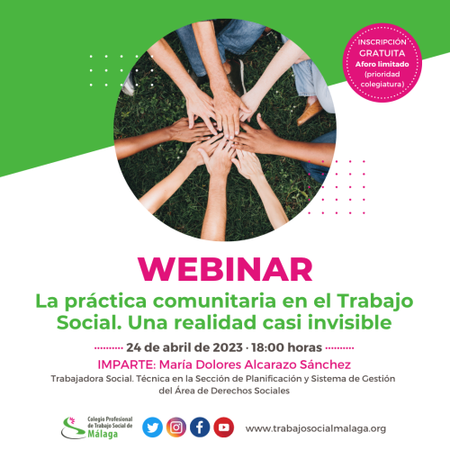 El próximo 24 de abril de 2023 a las 18 horas tendrá lugar una nueva charla organizada por el Colegio Profesional de Trabajo Social de Málaga. En esta ocasión, Mª Dolores Alcarazo Sánchez, Trabajadora Social, Técnica en la Sección de Planificación y Sistema de Gestión del Área de Derechos Sociales, nos dará a conocer la Práctica Comunitaria en el Trabajo Social.