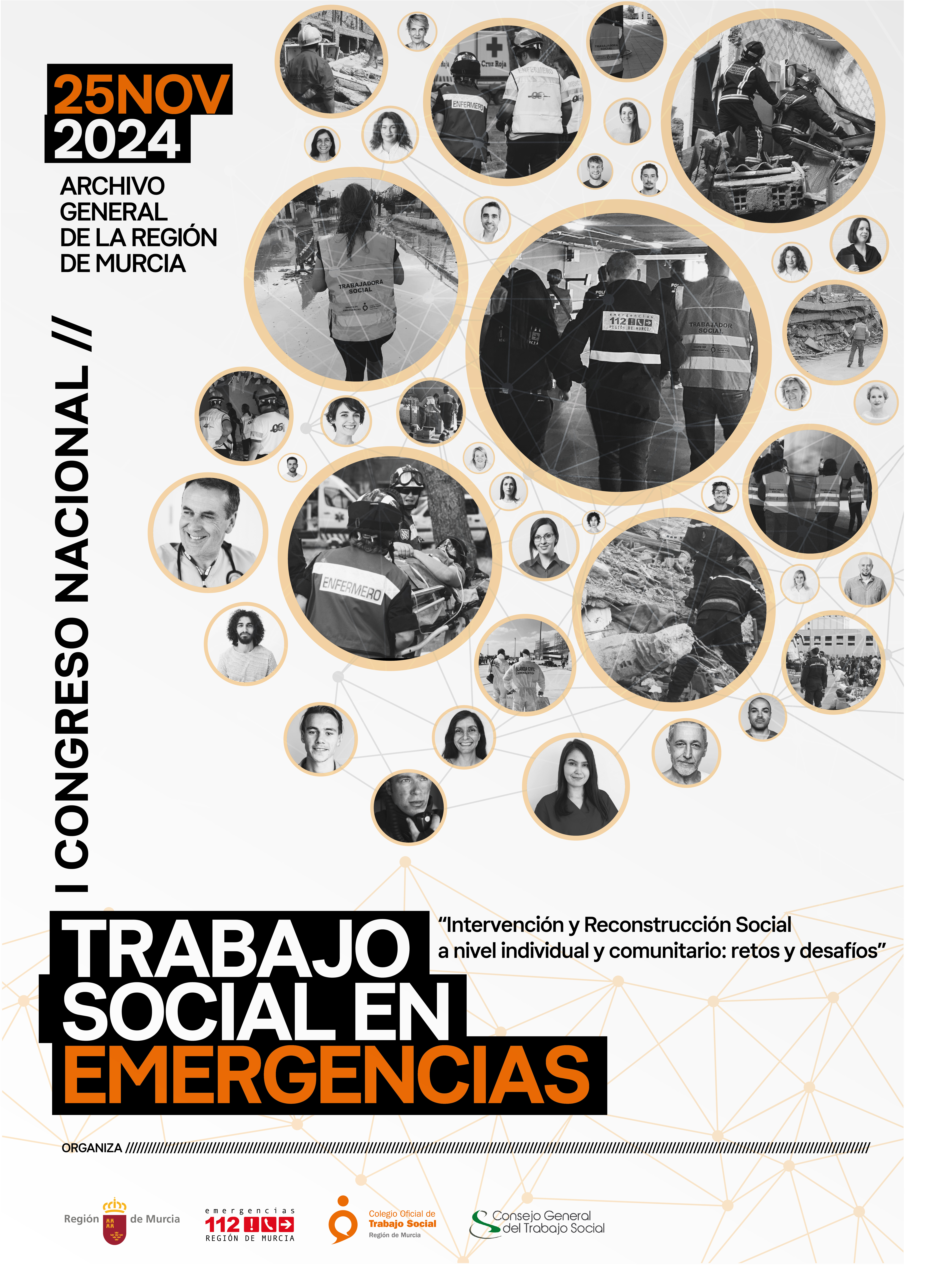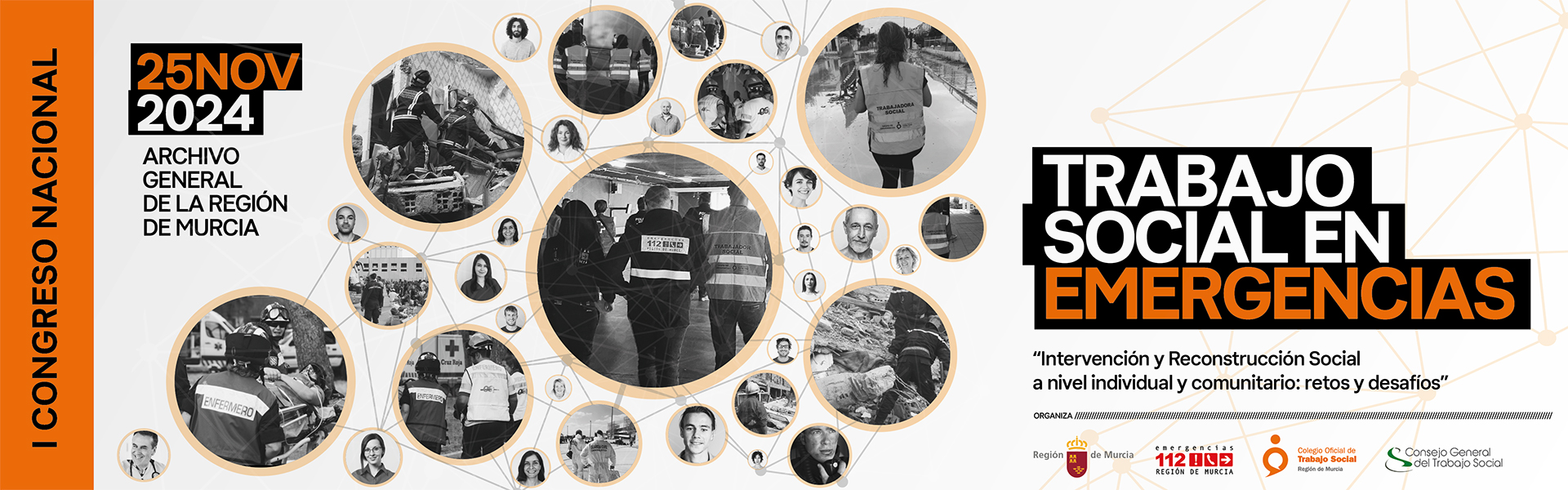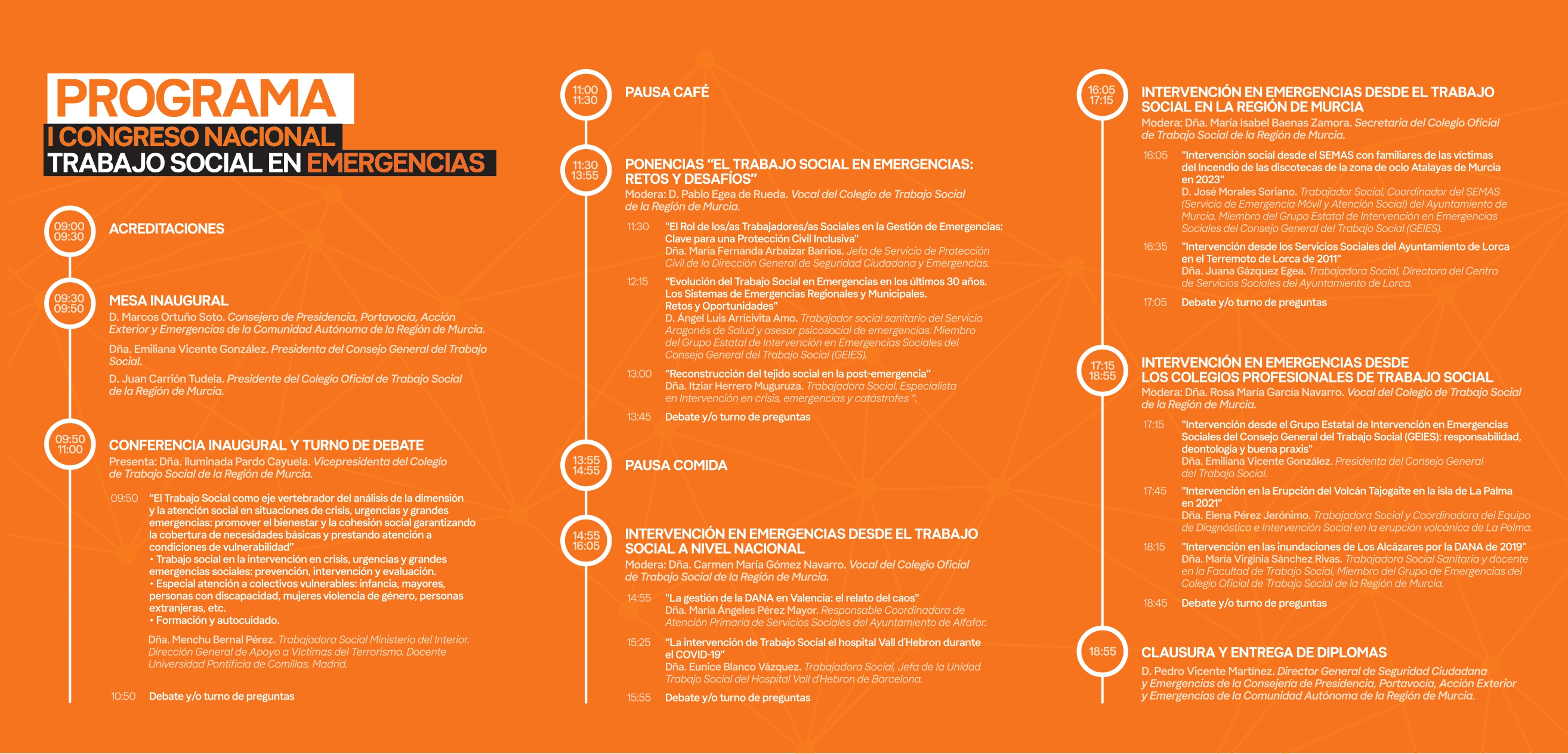 - 16:05 h. “Intervención social desde el SEMAS con familiares de las víctimas del Incendio de las discotecas de la zona de ocio Atalayas de Murcia en 2023”. D. José Morales Soriano. Trabajador Social, Coordinador del SEMAS (Servicio de Emergencia Móvil y Atención Social) del Ayuntamiento de Murcia. Miembro del Grupo Estatal de Intervención en Emergencias Sociales del Consejo General del Trabajo Social (GEIES).