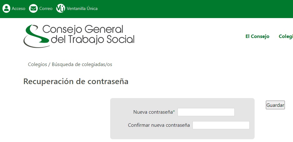 Paso 3: Dicho enlace te redirigirá a una página similar, la del Consejo General del Trabajo Social, para que crees tu nueva contraseña (recuerda volver a entrar en la página del Colegio para acceder al contenido que querías consultar.