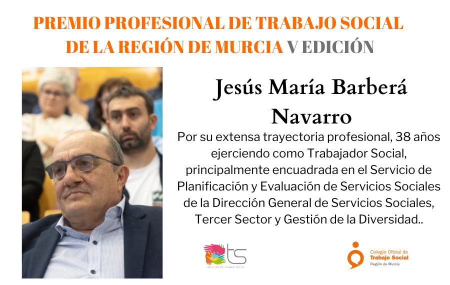 V Edición 24 de marzo de 2025Premiado: D. Jesús María Barberá Navarro, por su extensa trayectoria profesional, 38 años ejerciendo como Trabajador Social, principalmente encuadrada en el Servicio de Planificación y Evaluación de Servicios Sociales de la Dirección General de Servicios Sociales, Tercer Sector y Gestión de la Diversidad. |