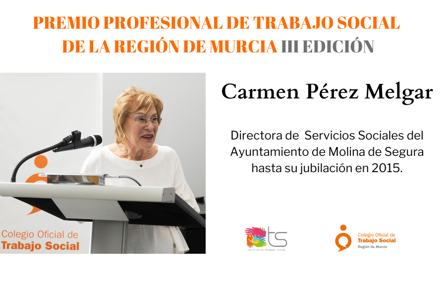 III Edición 21 de marzo de 2023Premiada: Carmen Pérez Melgar, Trabajadora Social con más de cuarenta años de experiencia profesional, principalmente en el ámbito de Servicios Sociales y como profesora de la Universidad de Murcia. |