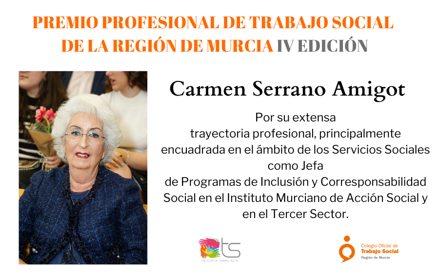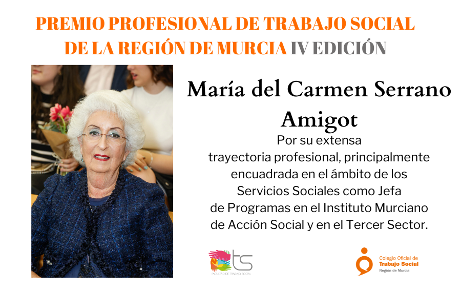 IV Edición 20 de marzo de 2024Premiada: Dña. María del Carmen Serrano Amigot, por su extensa trayectoria profesional, principalmente encuadrada en el ámbito de los Servicios Sociales como Jefa de Programas en el Instituto Murciano de Acción Social y en el Tercer Sector. |