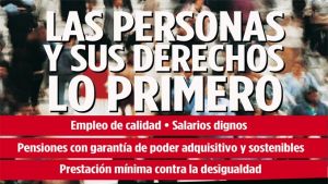 Los representantes de los trabajadores y trabajadoras de este país exigimos este cambio. Por todo ello, CCOO y UGT, nos dirigimos al nuevo Gobierno y a los partidos políticos con representación parlamentaria para que se prioricen las siguientes actuaciones, que entendemos imprescindibles para solucionar los problemas laborales y sociales más graves de nuestro país, que son los de la mayoría de la sociedad española, y les emplazamos a que se comprometan a llevarlas a cabo: