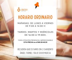 PARA ATENCIÓN PRESENCIAL ES IMPRESCINDIBLE SOLICITAR CITA PREVIA o consultar previamente en el 968 28 48 20 o gestionmurcia@cgtrabajosocial.es por razones organizativas y con el fin de evitar cualquier incidencia.