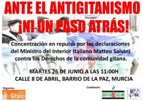 - La Fundación Secretariado Gitano convoca a una concentración, contando con la colaboración de Convivir sin Racismo y EAPN Región de Murcia y con el apoyo a nivel nacional de las entidades que conforman el Consejo Estatal del Pueblo Gitano (CEPG) ante el discurso de odio antigitano del ministro italiano, Matteo Salvini, proponiendo crear un censo de personas gitanas con el fin de expulsar a aquellas que estén en situación irregular en Italia, y lamentando tener “que quedarse con el resto”, que son la expresión máxima del discurso de odio antigitano.
