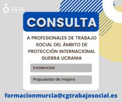 Desde el Colegio informamos a las/os profesionales que trabajen con personas desplazas por la Guerra en Ucrania, que pueden contactar con el Colegio a través del mail formacionmurcia@cgtrabajosocial.es para trasladar cualquier dificultad, incidencia, necesidad, etc. que se estén encontrando, así como propuestas de mejora en la gestión de las medidas adopatadas para hacer frente a esta crisis humanitaria derivada del conflicto bélico.