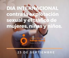 El colegio conmemora el “Día Internacional contra la Explotación Sexual y el Tráfico de Mujeres, Niñas y Niños” reivindicando el derecho a una vida libre de cualquier forma de violencia. Instando a los poderes públicos, agentes sociales y a la ciudadanía en general, a sensibilizarse con esta problemática y a continuar trabajando en el fortalecimiento de los sistemas integrales de protección de las mujeres, niñas\niños y adolescentes ante la trata y tráfico con fines de explotación sexual.