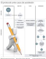 Uno de los más complicados es precisamente el que se refiere a las autolesiones, muy difíciles de prever. Así, en este caso, durante la fase de detección el protocolo recomienda a los profesores y al orientador del centro estar atentos a los alumnos más vulnerables emocionalmente, con signos de depresión, ansiedad o desesperanza, «o con menos recursos para afrontar situaciones difíciles, compartirlas y expresarlas». Si el estudiante se automutila en el centro, el protocolo marca que se presten los primeros auxilios y, en función de la gravedad, se llame a los servicios de emergencias y a los padres del estudiante. La guía marca también cómo actuar con los compañeros del alumno, y recomienda, entre otras muchas actuaciones, «evitar o desarticular procesos de aislamiento o de rechazo hacia el compañero o, por el contrario, de mitificación o veneración, previniendo el ‘efecto Werther’ o de imitación, dado que puede aparecer una tendencia de los niños y jóvenes a identificarse con las soluciones drásticas adoptadas por las personas que intentaron o cometieron suicidio».