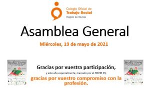 El Colegio Oficial de Trabajo Social de la Región de Murcia ha celebrado en fecha 19 de mayo de 2021 la Asamblea General Ordinaria en modalidad on line, en la que se aprobó de forma unánime el acta de la asamblea anterior y la memoria anual de 2020.