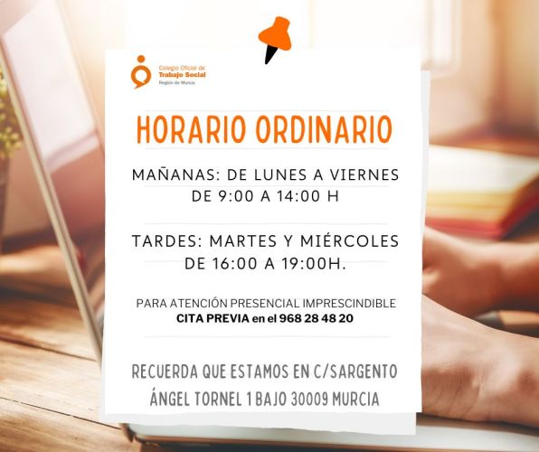 Os recordamos que el Colegio, según Convenio de Colegios Profesionales de la Región de Murcia, inicia su jornada intensiva a partir del 1 de junio hasta el 15 de septiembre de 2025.