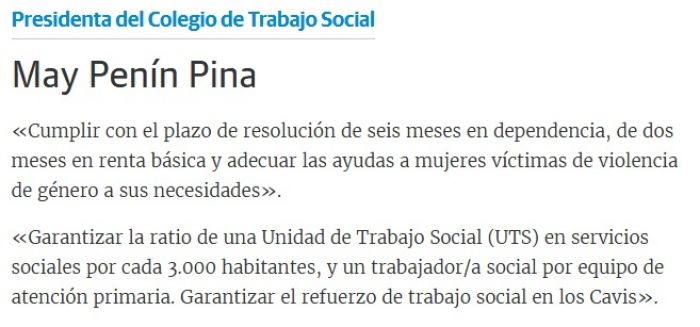 «Garantizar la ratio de una Unidad de Trabajo Social (UTS) en servicios sociales por cada 3.000 habitantes, y un trabajador/a social por equipo de atención primaria. Garantizar el refuerzo de trabajo social en los Cavis».