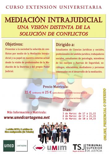 En el Centro Asociado de la UNED de Cartagena se va a llevar a cabo el Curso de Extensión Universitaria “MEDIACIÓN INTRAJUDICIAL. Una visión distinta de la solución de conflictos”